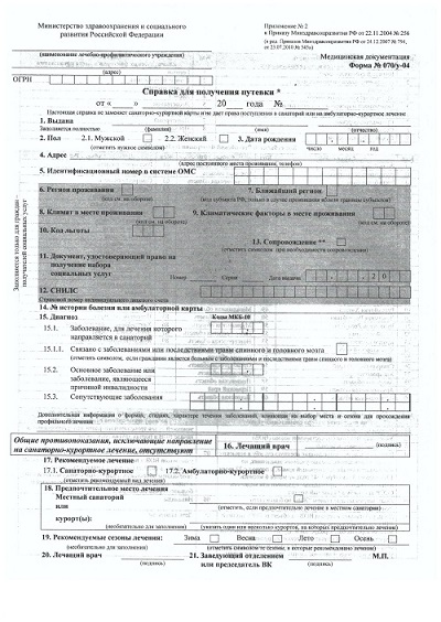 2. Оздоровительный отдых в санатории.Для санатория также требуется эта справка, которая включает заключение о том, что вы нуждаетесь в оздоровительных процедурах и лечении. Благодаря этой справке можно определить ваше заболевание и направить вас в нужный по профилю санаторий.
