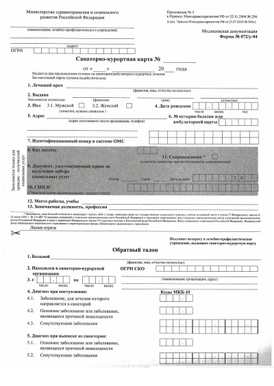 Сам бланк курортной карты состоит из двух частей: санаторно-курортная карта и талон. Талон заверяется подписями лечащего врача, руководителя отделения и председателя врачебной комиссии. Эти подписи и заверения вы увидите на своем медицинском документе.