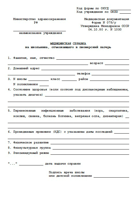 С необходимостью получения медицинской справки формы 079/у сталкиваются прежде всего родители, готовящиеся отправить своего ребенка в детский оздоровительный лагерь. Для отправки ребенка в летний лагерь родителям понадобятся: свидетельство о рождении (или паспорт, если ему уже исполнилось 14 лет), медицинская страховка на весь срок пребывания в лагере (особенно это актуально для лагерей, расположенных в других странах, так как на территории России будет действовать обычный полис ОМС), и, конечно, медицинская справка в лагерь, оформляемая участковым врачом или, реже, врачом школы.